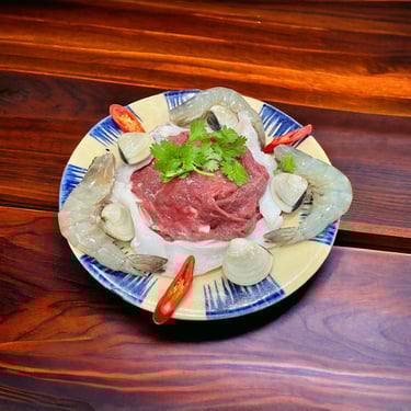 Topping lẩu gồm có: Ba chỉ bò Mỹ cuộn, mực tươi, tôm, nghêu, đậu hũ phô mai và thanh cua.